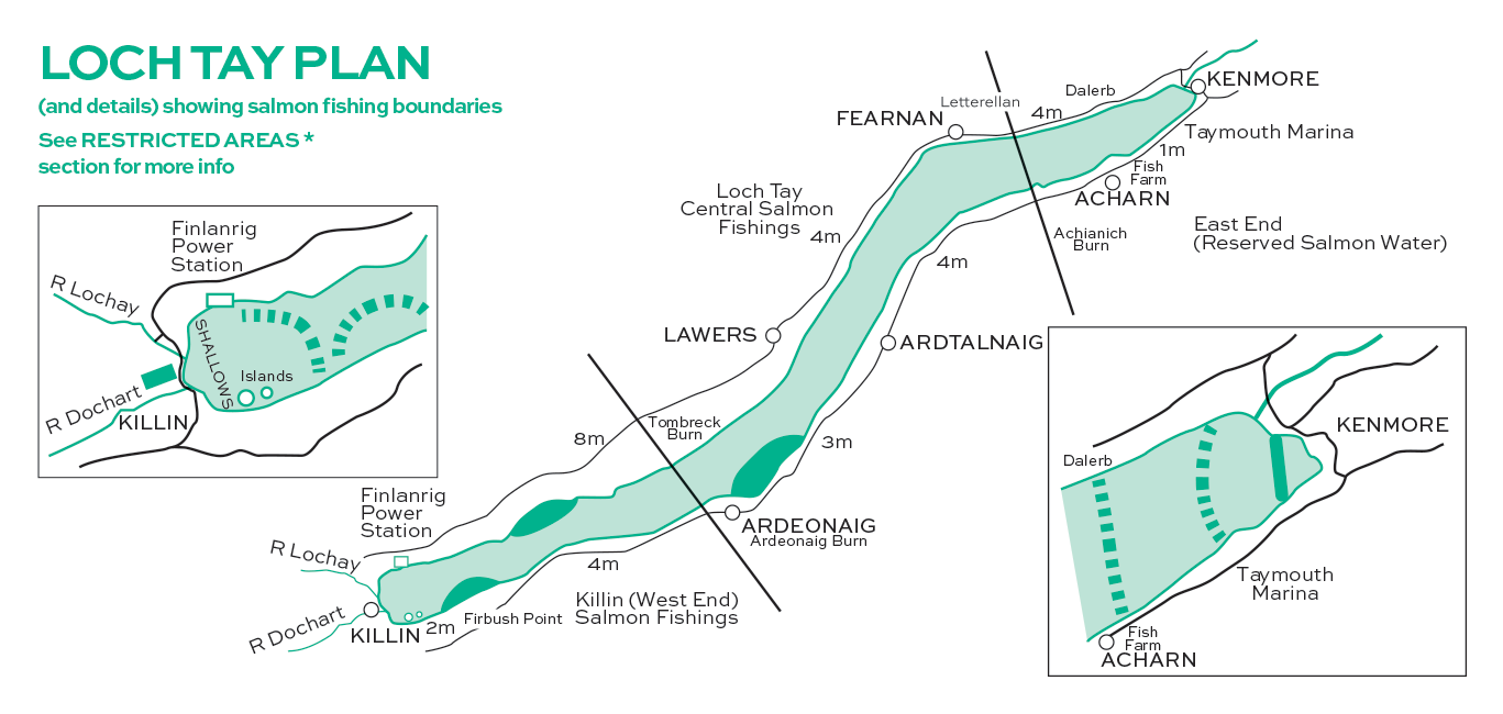 2. Fishing on Loch Tay is restricted to the areas east of a line drawn from Lawers Burn on the north side, to Manse Burn on the south side for fishing controlled by East Loch Tay Angling Club and Killin Angling Club to the west.